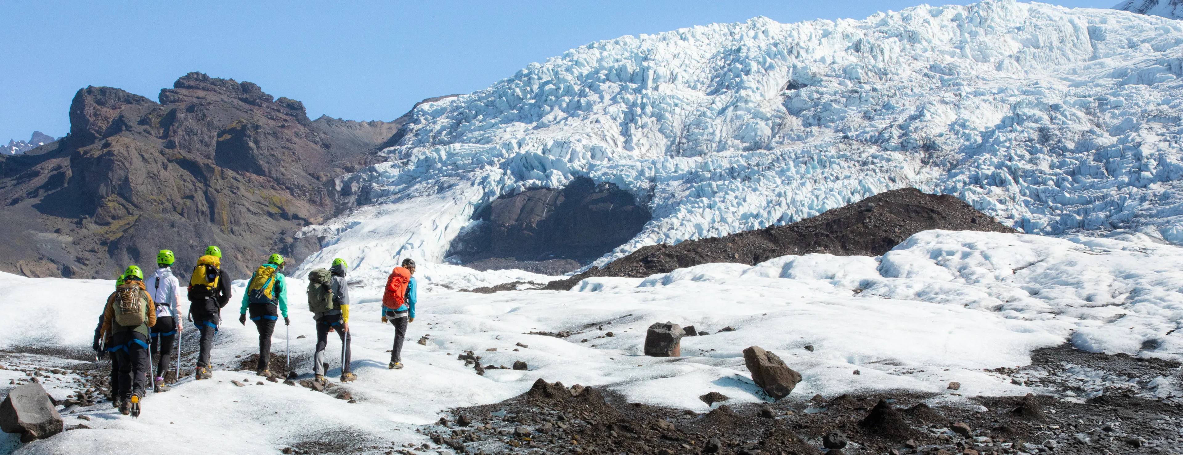 After gearing up, we take a 15-minute ride to the glacier car park, followed by a 15-minute walk to the edge of the ice. Along the way, your guide will show how the glacier has retreated over time, pointing out exposed bedrock and the nearby meltwater lagoon. Once on the ice, your guide will teach you how to walk safely using your equipment.