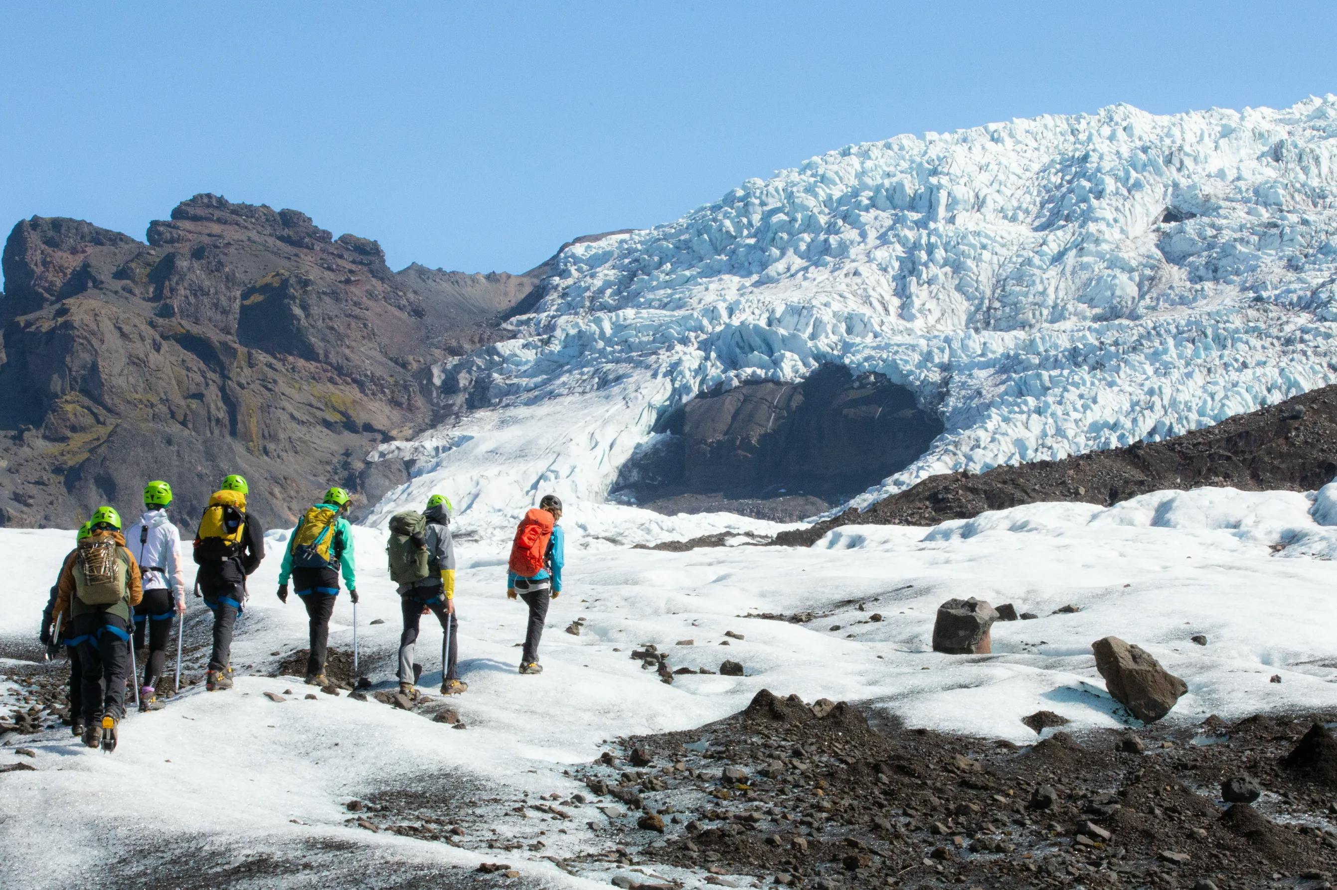 After gearing up, you will walk for approximately 20 minutes toward the glacier's edge. Along the way, your guide will point out the visible effects of the receding ice, such as marks on the bedrock and a meltwater lagoon. Once at the ice, your guide will provide a full safety briefing and instruct you on how to walk safely with your equipment.