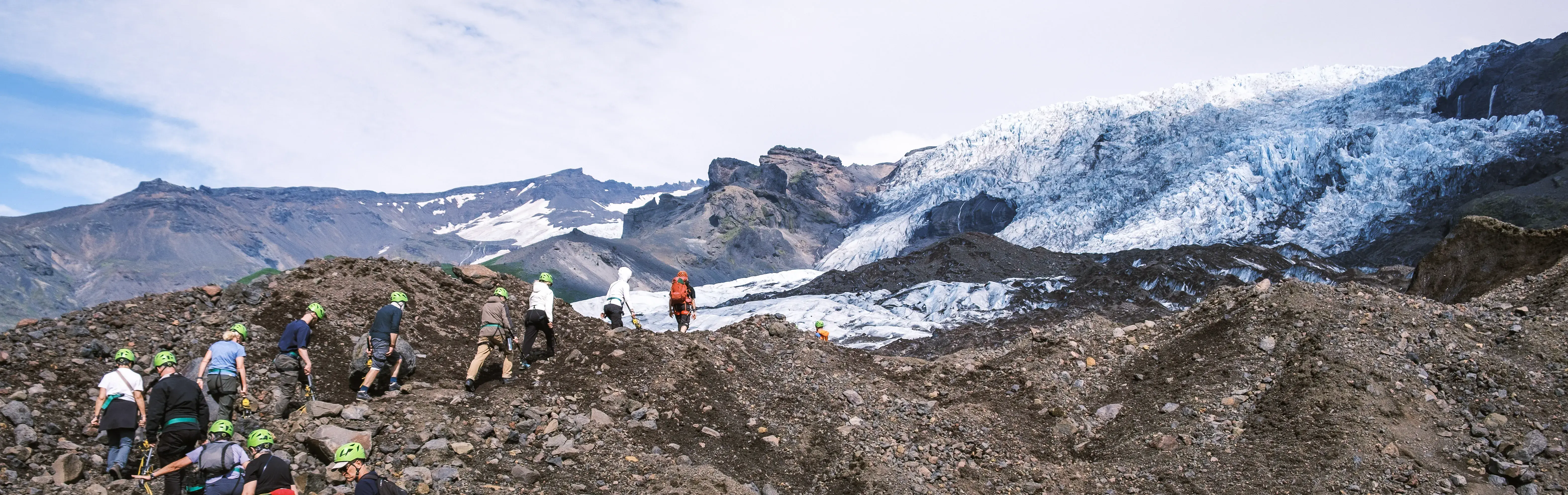 The main adventure is the Glacier Hike on Sólheimajökull, an outlet of the larger Mýrdalsjökull glacier. Once at the glacier base, professional guides will provide essential equipment, including crampons and ice axes. Participants should be prepared for an easy to moderate physical activity level. The hike offers a direct experience with the ice, where you can observe crevasses and the unique textures of the glacier ice.