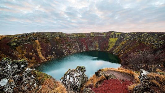 Unlike many other Golden Circle tours, we also include a stop at Kerið volcanic crater lake, created by where we can see the striking contrasts between maroon, black, and mossy green colors down the slope, and turquoise water filled the crater.