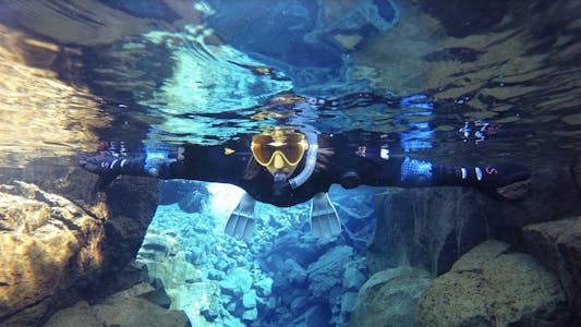The Silfra Fissure is located in Thingvellir National Park, a UNESCO World Heritage site. Once our minibus arrives there, you will listen as your experienced certified PADI Dive Master provides a safety briefing. Then, you will receive all of the necessary equipment for snorkeling in Silfra, including neoprene hoods and gloves, a thermal undersuit, a drysuit, and of course mask, snorkel and fins. This equipment will keep you floating throughout your time in the fissure, as well as offering a protection against the cold glacier water. Once in the water, your eyes will meet the incredible shades of blue so prevalent in the fissure, as well as the natural underwater flora of canyon walls.