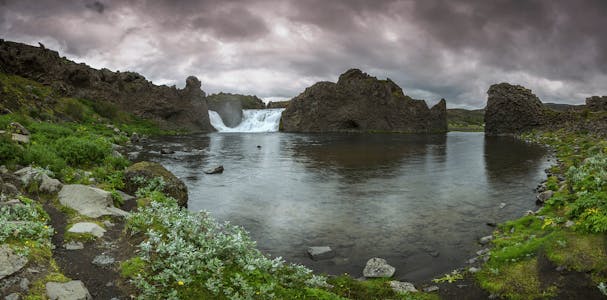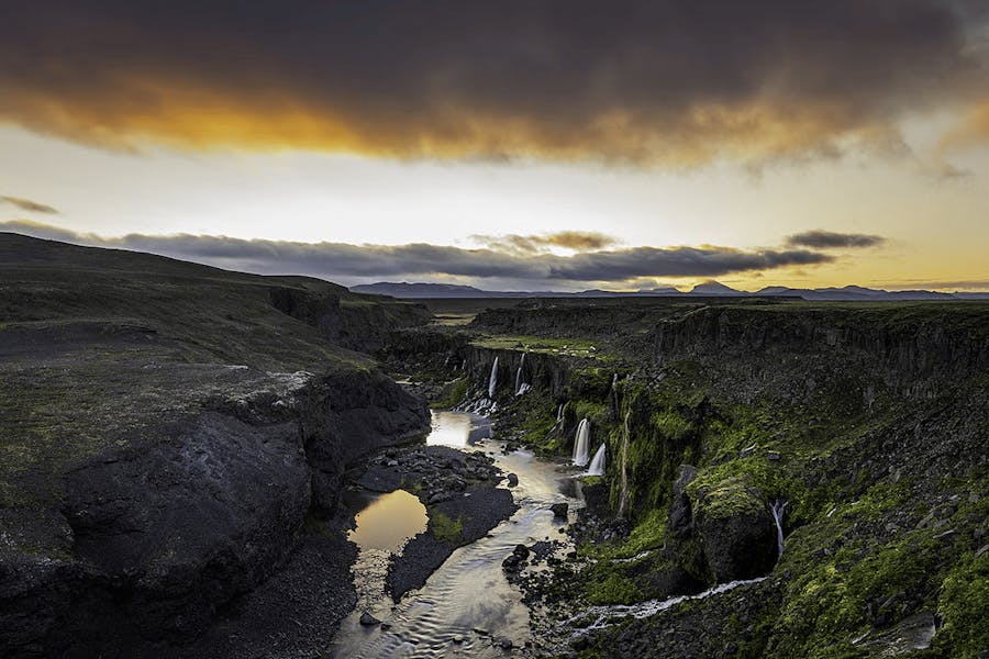 Explore the surreal beauty of Landmannalaugar, where rainbow-colored rhyolite mountains and vast lava fields stretch across the horizon. Feel the thunder of Háifoss, one of Iceland’s tallest waterfalls, as it plunges dramatically into the canyon below. Discover lesser-known treasures like the twin falls of Hjálparfoss and the mesmerizing Hnausapollur Volcanic Crater, filled with sapphire-blue waters.