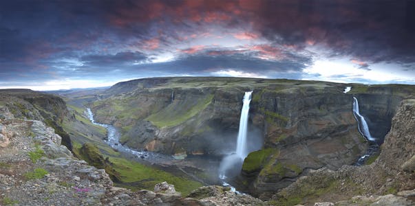 Your first stop is Hjálparfoss, a picturesque twin waterfall framed by unique basalt columns and lava formations — a peaceful place to start the day. Then it’s onward to Háifoss, plunging 122 meters into a canyon surrounded by steep cliffs. The nearby Granni waterfall adds to the dramatic atmosphere, showcasing the wild power of Icelandic nature.