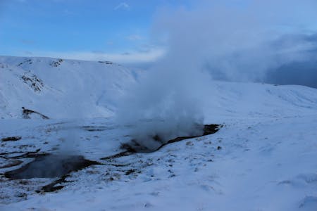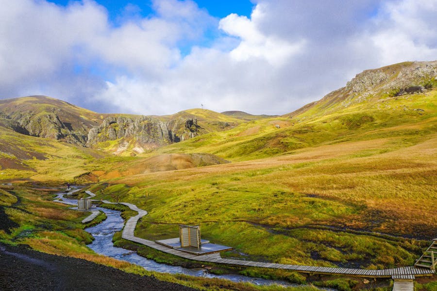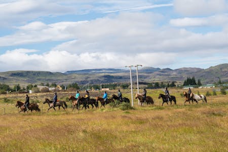 Embark on an adventure in the great outdoors with our horse riding and hot springs tour. Start at our farm Vellir for a 1.5 to 2-hour ride through meadows and lava fields, followed by a light lunch at Hótel Eldhestar. After lunch, take a 5-minute drive to hike the beautiful geothermal valley of Reykjadalur, passing the waterfall Djúpagilsfoss and hot springs, and have the opportunity to take a relaxing bath in a warm river. Enjoy panoramic views of volcanic mountains, Hveragerði village, and the coastline, with a chance to see the Westman Islands. The tour concludes with a coffee and cake at Eldhestar riding center.