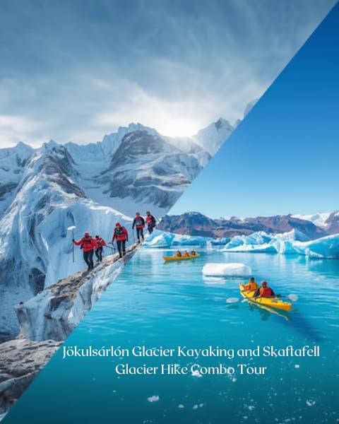 This full-day combo package offers two essential glacier experiences in Southeast Iceland for maximum adventure. Highlights include a guided kayaking adventure among the icebergs of Jökulsárlón Glacier Lagoon and an exhilarating glacier hike on a Vatnajökull outlet glacier in Skaftafell Nature Reserve. This tour efficiently pairs two distinct, guided activities—on water and on ice—in one day. All necessary safety gear and instructions for both the kayaking and glacier trekking are provided by certified guides.