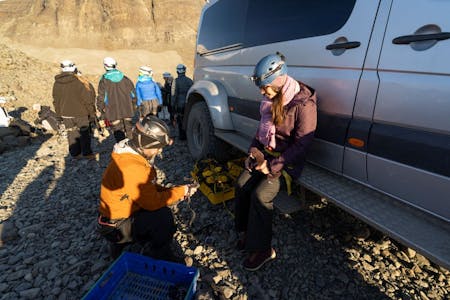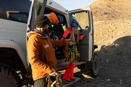 The tour begins at our comfortable meeting point in Hof, located very close to the glacier. Our indoor facility is cozy and offers free parking, which allows you to avoid the parking fees charged at the Skaftafell Visitor Centre. Please arrive 20 minutes before departure to meet your highly qualified English glacier guide. All essential safety gear is provided, including a helmet, crampons, harness, and ice axe.