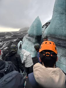 At the cave entrance, your guide will provide all safety gear, including helmets, headlamps, and crampons, along with a safety briefing. You will then ascend a small slope to step onto the glacier ice for the first time. Inside the cave, you will explore its mesmerizing colors and formations, crossing small bridges and witnessing the striking combination of ash layers and blue ice. Your guide will ensure you have time for photos and to simply enjoy the magnificent environment.