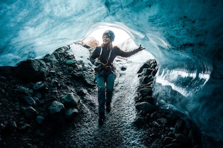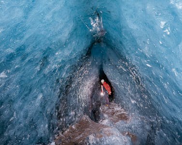 You will spend about 3 hours hiking on the glacier, exploring the uniquely carved landscapes of the Falljökull outlet. Your guide will lead you to the most magnificent parts of the ice, including fascinating geological formations like deep crevasses and moulins. The most memorable part of the tour is the opportunity to walk inside the naturally formed blue ice cave, giving you an up-close look at the dazzling blue ice. Throughout the excursion, you will learn about the formation and geology of glaciers and their constant change.After returning to the meeting point, enjoy a complimentary hot drink (coffee/hot chocolate) and a candy bar.