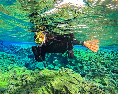 We offer multiple ways to experience Silfra, whether you're meeting us at the site or combining it with other Icelandic highlights. All tours include a professional guide, high-quality snorkeling gear, and a drysuit to keep you warm. Plus, you’ll receive free underwater GoPro photos of your adventure, as well as a post-tour treat of hot chocolate and a Hraun candy bar to warm you up after your dive.