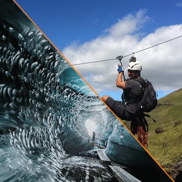 Experience the best of Iceland's "Fire and Ice" with this exciting combo tour. Your morning begins with a Super-Jeep ride to the Katla Volcano Ice Cave, where you'll explore vast, unique formations of ash and ice known as "Dragon Glass." Afterward, seek out an adrenaline rush with a thrilling Zipline adventure near Vík, featuring four different rides up to 240 meters long. You will hike a breathtaking river canyon and fly over stunning scenery, including the Hundafoss waterfall, offering an incredible bird's-eye view.