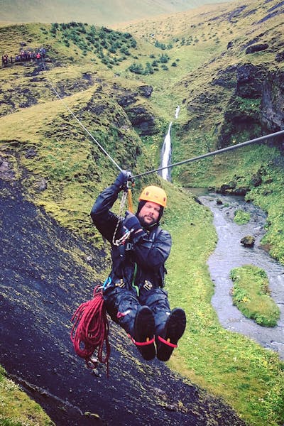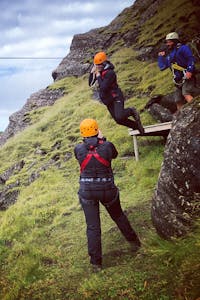 Part 2: Vík Zipline Adventure The second adventure begins at our base in Víkurbraut 5. We start with a short 5-minute drive, followed by a 5-minute hike to the first take-off platform, "Little Rush." The zipline tour includes a hike through the unique rock formation of Grafargil (Grave Canyon) and features four rides: 120m, the 240m-long "The Gentle Giant," a surprise line called "Leap of Faith," and the final line, "Big Rush," which flies you over Hundafoss waterfall. Detailed safety instructions are provided to ensure maximum comfort and safety as you enjoy the exhilarating bird's-eye views. The entire experience is a great adventure for all who enjoy a moderate thrill.