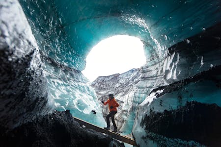 At the cave entrance, your guide will provide all safety gear, including helmets, headlamps, and crampons, along with a safety briefing. You will then ascend a small slope to step onto the glacier ice for the first time. Inside the cave, you will explore its mesmerizing colors and formations, crossing small bridges and witnessing the striking combination of ash layers and blue ice. Your guide will ensure you have time for photos and to simply enjoy the magnificent environment.