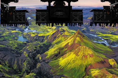 FlyOver Iceland is a state-of-the-art technology that gives you the feeling of flying. The seats hang suspended, with your feet dangling mid-air. In front of you is a 20-meter spherical screen that gives you an all-around viewing experience. The film was filmed on a helicopter with its nose down while filming, so the final results give you, the viewer, the ultimate feeling of actually being there, flying over fields, lakes, glaciers, fjords, and mountaintops. Scent, mist, and wind blow your way as you sit there, hitting all your senses.