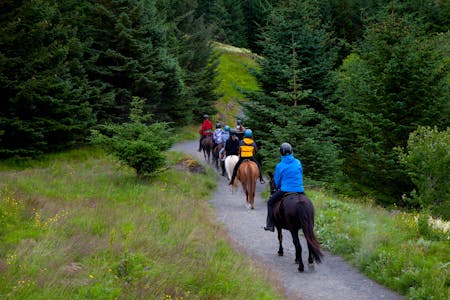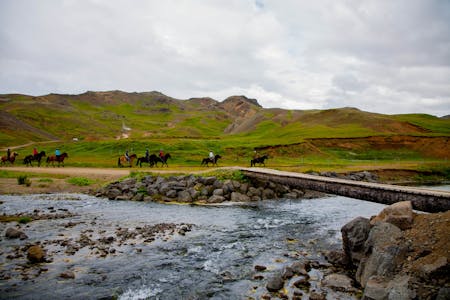 On the horse riding tour by hot springs, you'll have the opportunity to take in a range of landscapes. The ride begins on well-maintained trails that take you up a hill, through a green forest (a rare sight in Iceland), and along the mountain Reykjafjall. You'll pass many hot springs in the impressive and colorful geothermal area above the village of Hveragerði, also known as the "hot spring capital of the world." This region underwent significant expansion following an earthquake in 2008 and is constantly changing. The route also goes through volcanic hills above the village, which boasts a beautiful location between the volcano Hengill and the vast plains of the southern lowlands. You'll have a nice view of the Varmá river (called the "warm river" because geothermal water flows through it) and green valleys with rising steam in the distance.