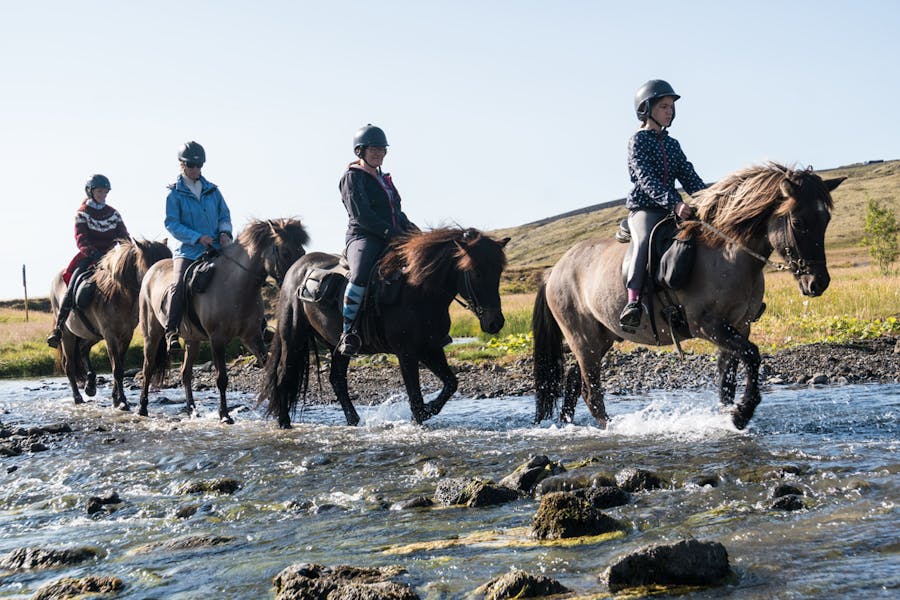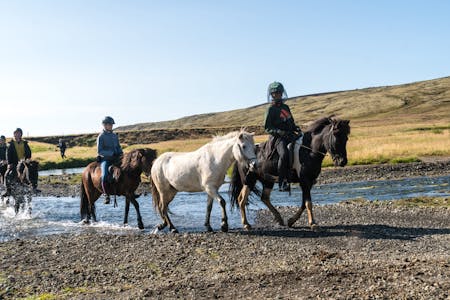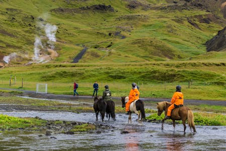 This tour provides the chance to witness spectacular sceneries and a variety of Icelandic nature. We will start our journey by riding along the Reykjafjall mountain and then through a peaceful forest to the vibrant geothermal valley with steamy hot springs, an area that expanded after an earthquake in 2008. As we head to the Hengill volcano, we can try the "tölt," a gait exclusive to the Icelandic horse. We make our way across the Djúpagilsfoss waterfall and some hot springs until we get to the Reykjadalur valley, where we can take a refreshing dip in a warm stream. The ride down the valley offers stunning views of Hveragerdi, the countryside, and the Westman Islands if the weather permits. Lastly, we head back to the farm and enjoy coffee and homemade cake. Don't forget to bring your swimsuit and towel!