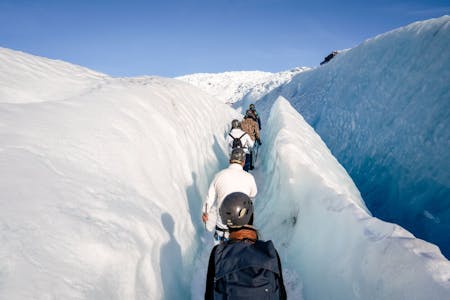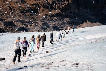After gearing up, you will walk for approximately 20 minutes toward the glacier's edge. Along the way, your guide will point out the visible effects of the receding ice, such as marks on the bedrock and a meltwater lagoon. Once at the ice, your guide will provide a full safety briefing and instruct you on how to walk safely with your equipment.