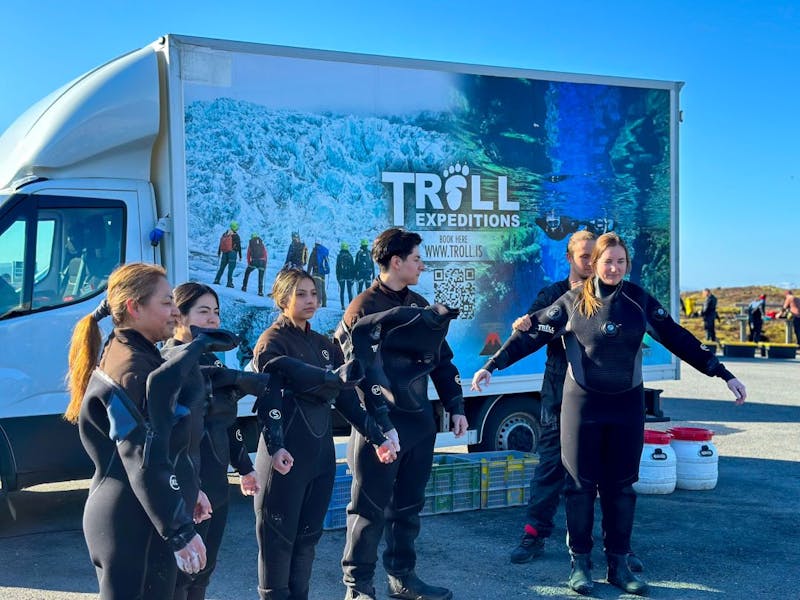You can leave all your clothes and other items in our Tröll bags, which are kept securely at all times. You will then start walking towards Silfra with your dry suit on. The walk to Silfra is short, roughly 5 minutes long.